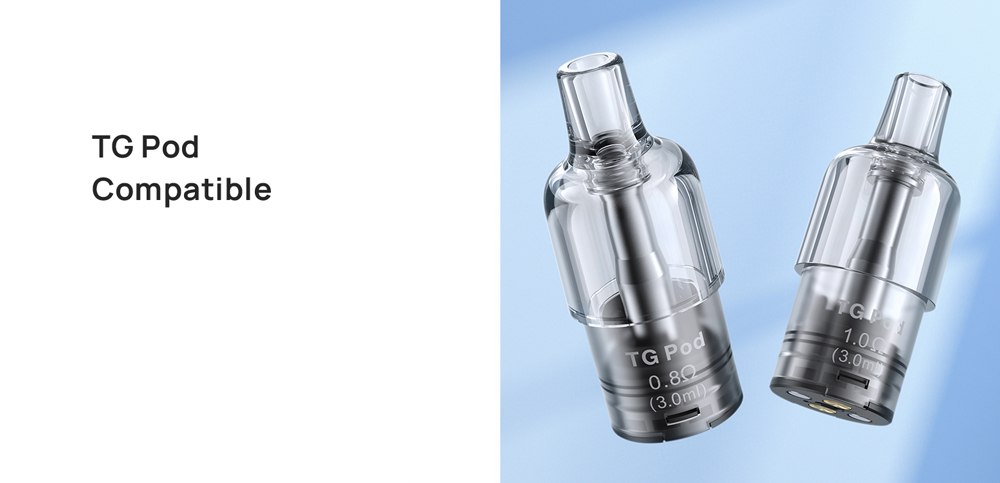 Τα TG Pod είναι συμβατά και με τις συσκευές Cyber G και Cyber G Slim. Το προ-εγκατεστημένο TG Pod 0.8Ω είναι για τους λάτρεις του cloud-chasing, προσφέροντας έντονη παραγωγή ατμού, ενώ το TG Pod 1.0Ω παρέχεται για βέλτιστη απόδοση με άλατα νικοτίνης, προσφέροντας ένα απαλό και αυθεντικό προφίλ γεύσης.