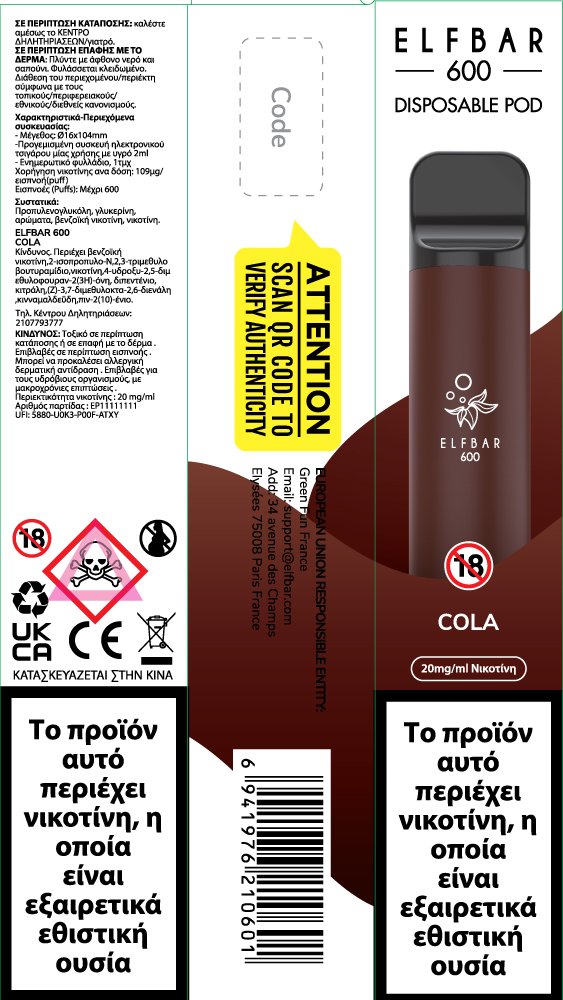 Elf Bar 600 20mg 2ml Cola | Disposable προγεμισμένο με υγρό αναπλήρωσης και απόδοση έως 600 εισπνοές