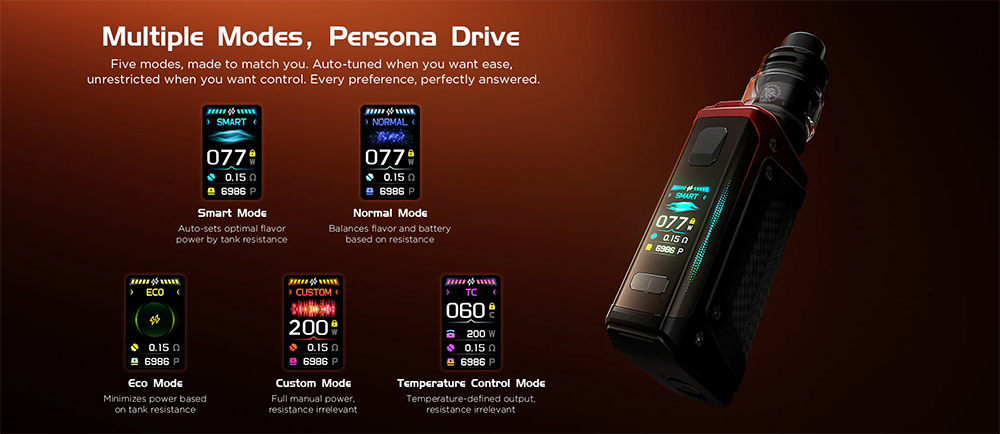 Το Aegis Legend 5 Mod συνδυάζει δύο εξωτερικές μπαταρίες 18650 (δεν περιλαμβάνονται) με το chipset AS 4.0, παρέχοντας μέγιστη ισχύ εξόδου έως 200W με γρήγορη ενεργοποίηση στα 0,01s. Διαθέτει βαθμολογία IP68 για αντοχή στο νερό, τη σκόνη και τις πτώσεις. Η υφή aeroflow, οι λεπτομέρειες με χάραξη λέιζερ και το ανθεκτικό μεταλλικό υλικό C-frame το καθιστούν κομψό και εργονομικό. Η δυναμική οθόνη 1,08” με προσαρμόσιμες λωρίδες φωτισμού εξασφαλίζει εύκολη χρήση σε οποιοδήποτε φωτισμό. Υπάρχουν πολλαπλές λειτουργίες για να προσαρμόσετε το άτμισμά σας: Smart, Normal, Eco, Custom, TC.