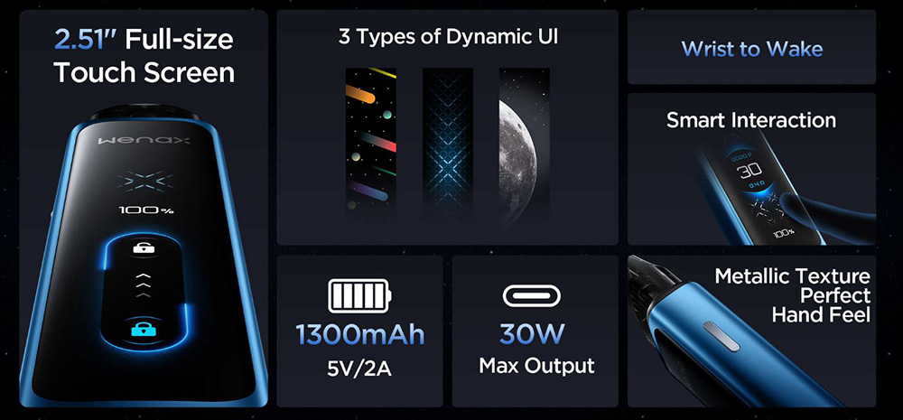 Το Wenax Q Ultra είναι ένα ευέλικτο pod που έχει σχεδιαστεί για να καλύπτει όλες τις προτιμήσεις ατμίσματος. Διαθέτει οθόνη αφής HD 2,51 ιντσών που επιτρέπει στους χρήστες να προσαρμόζουν την ισχύ εξόδου, τις λειτουργίες και τα θέματα διεπαφής για μια πιο εξατομικευμένη εμπειρία. Η συσκευή είναι εξοπλισμένη με ένα ρυθμιστή ροής αέρα τοποθετημένο στο πλάι για ακριβή έλεγχο και είναι συμβατή με όλα τα Q Pods. Η μεγάλη χωρητικότητα της μπαταρίας του εξασφαλίζει εκτεταμένη χρήση, καθιστώντας το μια αξιόπιστη επιλογή για ατμιστές που αναζητούν λειτουργικότητα και άνεση.