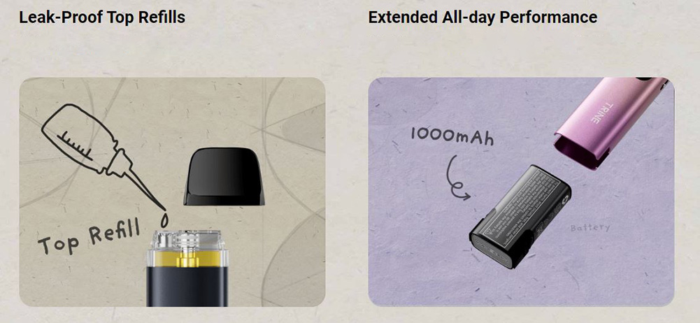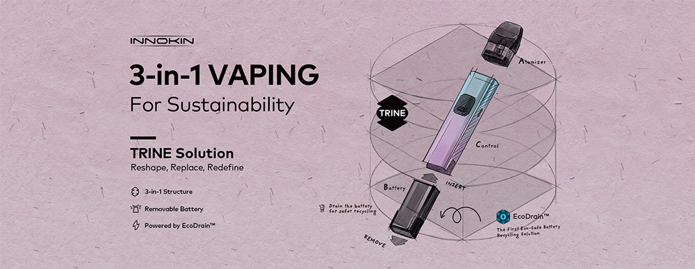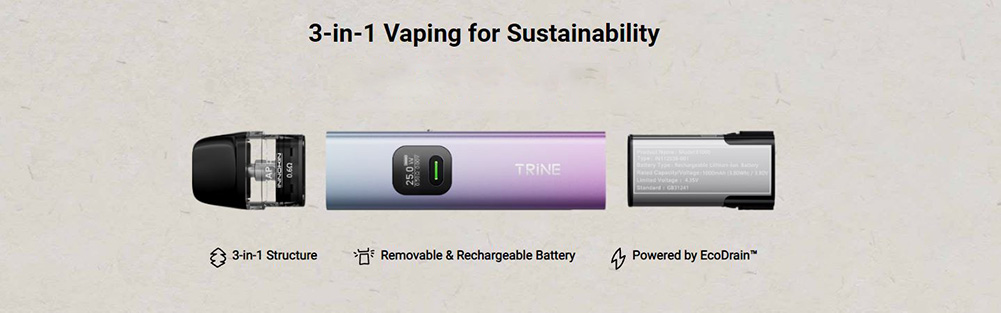 Παρουσιάζοντας την δομή 3 σε 1 – κύριο σώμα συσκευής, ατμοποιητής, αφαιρούμενη και επαναφορτιζόμενη μπαταρία – το Trine επενδύει στη βιωσιμότητα και την εξοικονόμηση, εξασφαλίζοντας εξαιρετική απόδοση με το καινοτόμο σύστημα αντικατάστασης μπαταρίας και την τεχνολογία EcoDrain.