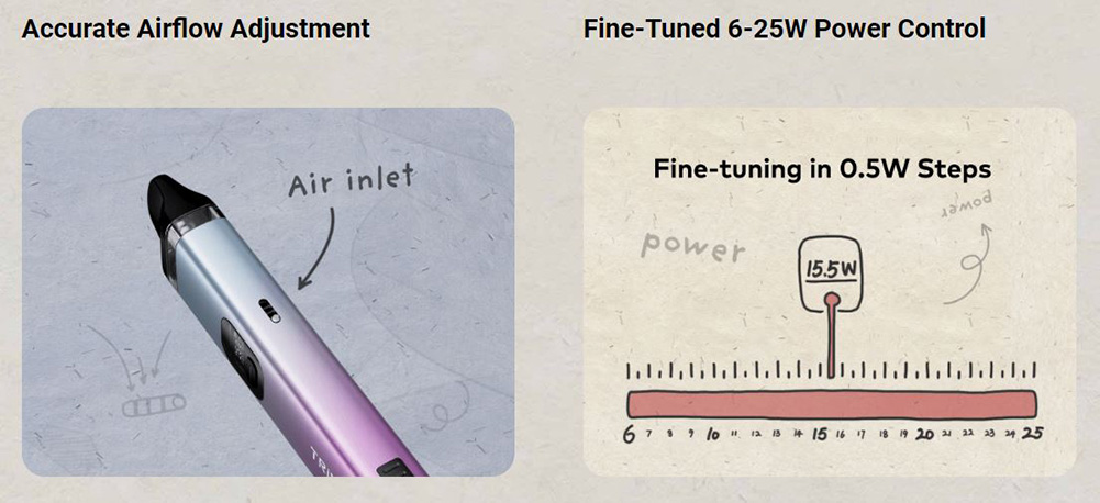 Αξιοποιήστε τη βέλτιστη ισχύ με την έξυπνη αναγνώριση pod της Trine. Από το ομαλό pod 0,8Ω στα 14W έως το έντονο pod 0,6Ω στα 25W, απολαύστε εξατομικευμένες εμπειρίες ατμίσματος με ευκολία.