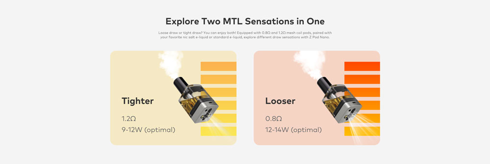 Mπορείτε να απολαύσετε δύο εμπειρίες ατμίσματος MTL! Εξοπλισμένο με αντίσταση mesh 0.8Ω και 1.2Ω, σε συνδυασμό με την αγαπημένη σας γεύση, εξερευνήστε διαφορετικές αισθήσεις με το z pod nano.