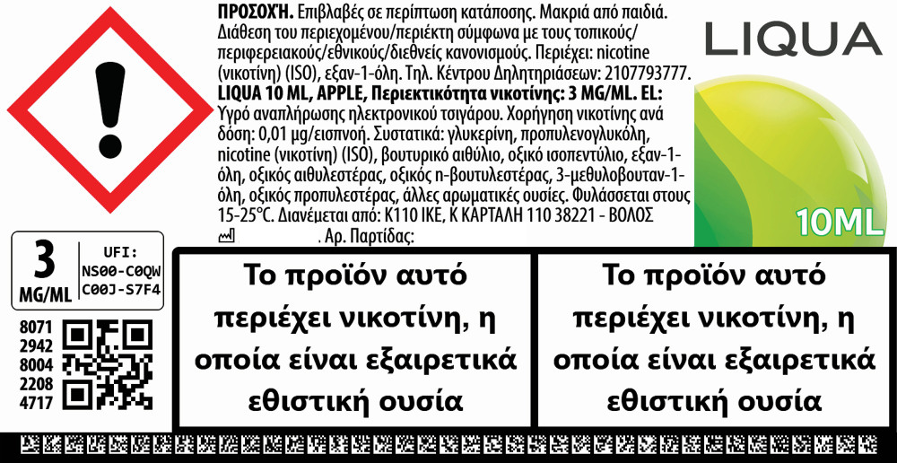Liqua Apple 3mg 10ml Υγρό Αναπλήρωσης