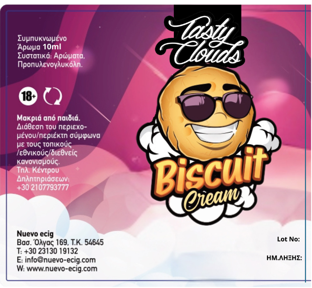 Biscuit Cream – Ένας συνδυασμός φρεσκοψημένου μπισκότου με πλούσια κρέμα βανίλιας σε απόλυτη ισορροπία. Ένα ακόμα υγρό από την Tasty Clouds που θα το λατρέψετε!!!!