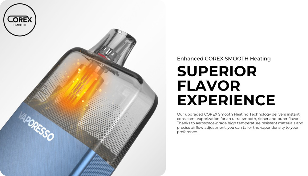 Η απόδοσή του υποστηρίζεται από ισχυρή μπαταρία 1400mAh μεγάλης διάρκειας και τη βελτιωμένη τεχνολογία COREX Smooth Heating, που εξασφαλίζει σταθερή, απαλή και πλούσια γεύση σε κάθε εισπνοή.