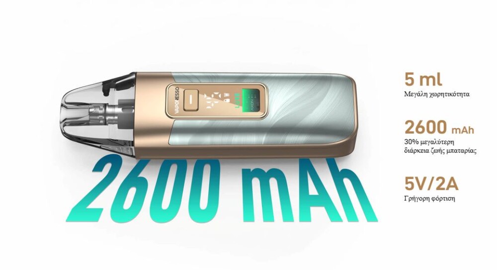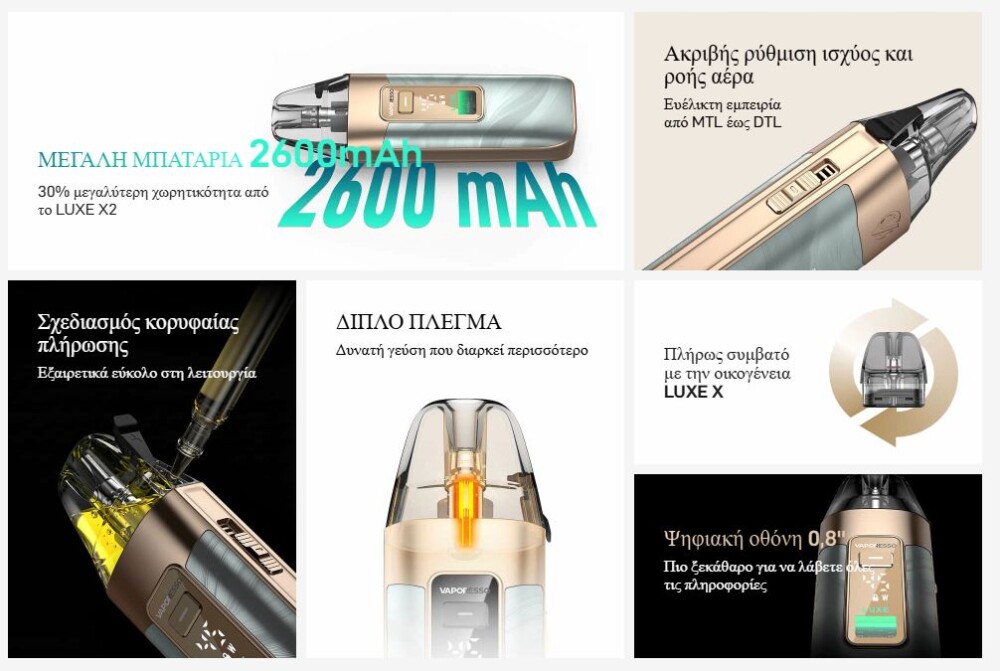 Το LUXE X3 διαθέτει πλέον μπαταρία 2600 mAh, μεγάλη δεξαμενή 5 mL και γρήγορη φόρτιση 5V/2A, θέτοντας ένα νέο σημείο αναφοράς στον κλάδο. Ο συμπαγής και ελαφρύς σχεδιασμός του το καθιστά εύκολο στη μεταφορά οπουδήποτε. Η εμπειρία ατμίσματος βελτιώνεται με ψηφιακή οθόνη 0,8”, κλείδωμα με ένα κουμπί και σύστημα αναπλήρωσης από πάνω για ευκολία. Η προηγμένη τεχνολογία Dual Mesh προσφέρει πλουσιότερη γεύση, ενώ ο έλεγχος ροής αέρα και το εργονομικά σχεδιασμένο επιστόμιο εξασφαλίζουν την απόλυτη ικανοποίηση από το άτμισμα.