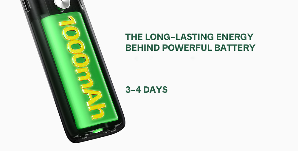 Η ενσωματωμένη μπαταρία 1000mAh υποστηρίζει εύκολα σταθερή ισχύ εξόδου για 3 με 4 ημέρες. Ακόμη και σε κατάσταση χαμηλής μπαταρίας, μπορείτε να ατμίζετε συνεχώς πάνω από 30 εισπνοές.