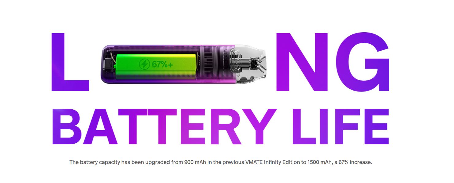 Το VMATE i2 είναι ένα starter POD γνωστό για την εξαιρετικά μεγάλη μπαταρία του. Με χωρητικότητα μπαταρίας 1500 mAh και αύξηση 67% στην ισχύ της μπαταρίας σε σύγκριση με τα προηγούμενα μοντέλα VMATE.