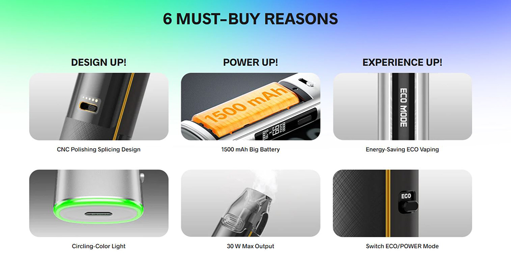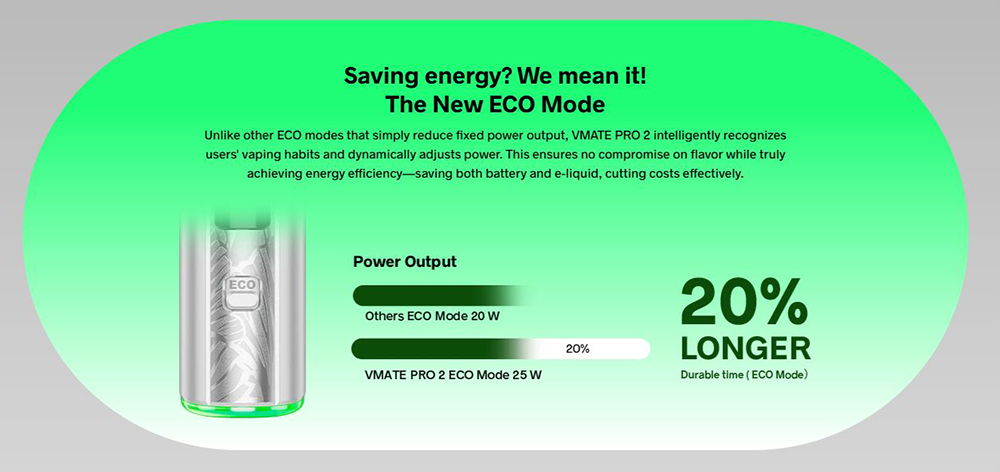 VMATE PRO 2 – Με ολοκαίνουργια λειτουργία ECO, είναι το πρώτο POD με έξυπνη δυναμική ισχύ, σε συνδυασμό με μια μεγάλη μπαταρία 1500 mAh. Εξοικονομεί ενέργεια ενώ παράλληλα προσφέρει μια ικανοποιητική εμπειρία ατμίσματος. Ο σχεδιασμός έχει επίσης αναβαθμιστεί πλήρως για μια εντυπωσιακή εμφάνιση, με 7 μοντέρνες επιλογές χρωμάτων. Νέα εμπειρία, νέος σχεδιασμός – αυτό είναι το ολοκαίνουργιο VMATE PRO 2!