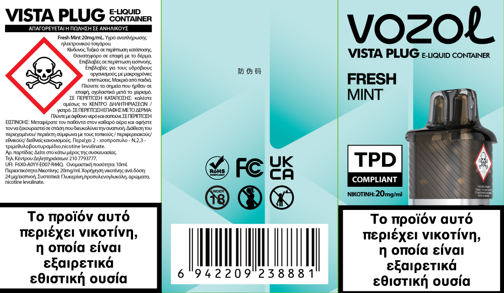 Vozol Vista Plug 20mg 2ml Prefilled Δεξαμενή + 10ml e liquid Fresh Mint